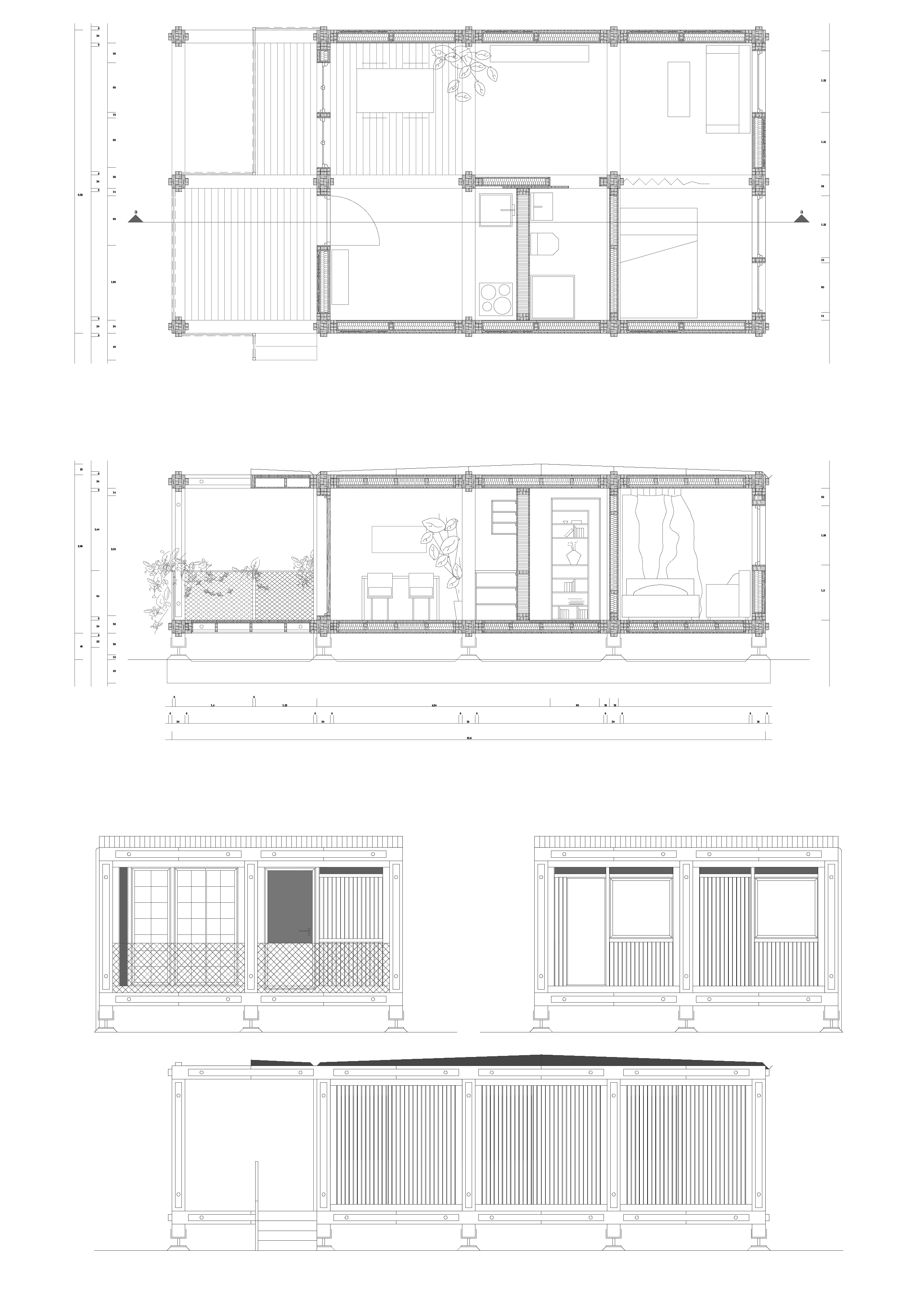 The module is joined together in a grid of ceilings and walls, whose prefabricated and standardized panels are placed in the wooden structure in a repeting principle.